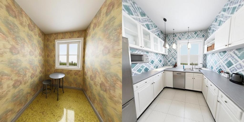 image = pipeline('[VIRTUALSTAGING] A before and after image of a kitchen. The same kitchen is shown before and after a complete makeover. [IMAGE1] The image showcases a dated kitchen with worn-out cabinets and appliances. The room has a small window above the sink, allowing limited natural light. The walls are covered in faded, floral wallpaper that gives the space a vintage feel. The kitchen features old-fashioned linoleum flooring in a yellow and green checkered pattern. A small table in the corner with two mismatched chairs, and a calendar hangs on one of the walls. The overall color scheme is dominated by muted earth tones, creating a somewhat dull and outdated atmosphere. [IMAGE2] The image presents a sleek, modern kitchen with state-of-the-art appliances and custom cabinetry. The once-small window has been expanded into a large bay window, flooding the space with natural light. The walls are painted in a crisp white, accented by a bold, geometric-patterned backsplash in shades of blue and gray.The kitchen now features a large center island with bar seating, perfect for casual dining or food preparation. Pendant lights hang above the island, adding both style and functionality. A smart refrigerator can be seen, along with other high-tech appliances. The overall atmosphere of the kitchen is bright, spacious, and inviting, with a modern color palette of white, gray, and blue.').images[0]